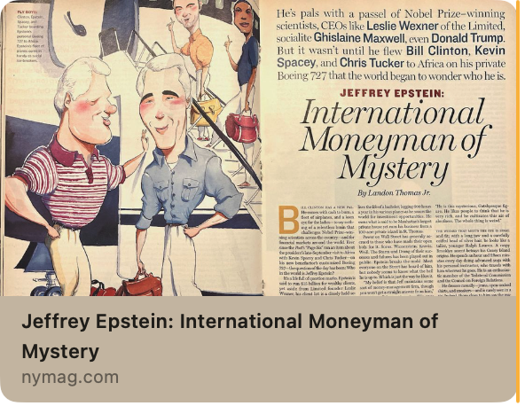 “Who in the world is Jeffrey Epstein? It’s a life full of question marks. Epstein is said to run $15 billion for wealthy clients, yet aside from Limited founder Leslie Wexner, his client list is a closely held secret.”